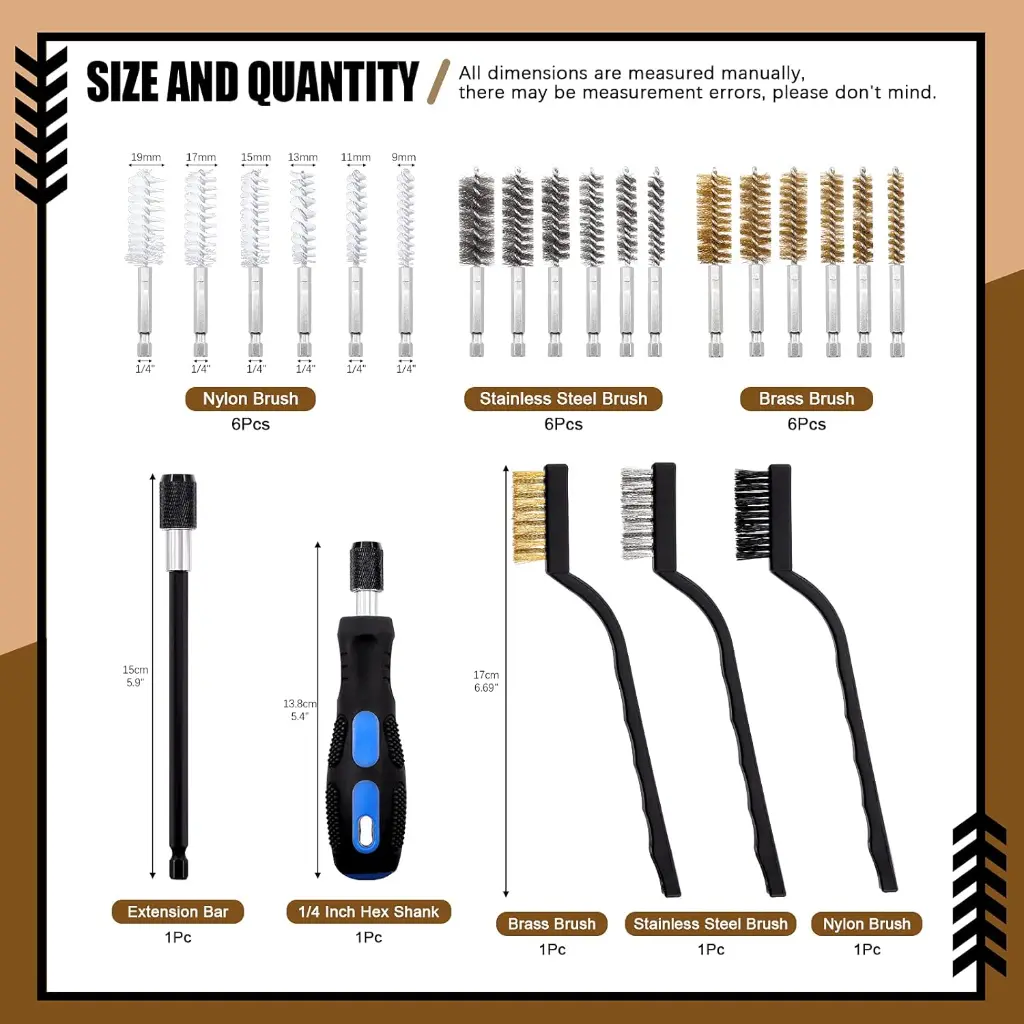 وصف سريع للمنتج | 🧹 Comprehensive 23-piece set for effective and deep cleaning — ideal for removing slag, rust, dirt, and weld residue 🧰 Includes bore brushes made of stainless steel, brass, and nylon in 6 different sizes to suit all tasks 🔩 Ergonomic handle and 1/4-inch hex rod for manual or drill use 💪 High-quality, long-lasting materials – durable design and twisted wires for powerful cleaning results |